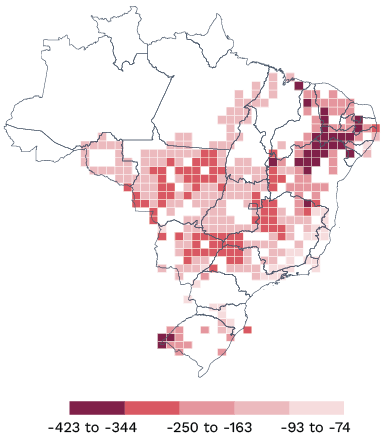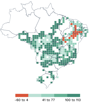 Applying potential price shocks to producers across Brazil showcases who could face outsized risks as different types of climate transitions occur. Producers that have low levels of production efficiency, higher costs for transporting products to market and those that have ties to illegal deforestation face the most risk.